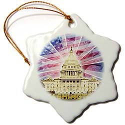 Washington DC patriotic American flag with Bald Eagle and Capitol building Ornament is measuring 3 inches. This Glossy Porcelain Snowflake Ornament is perfect gift for grandparents, aunts, uncles and friends. Commemorate each holiday season with a new ornament. Image is printed on both sides. Comes with the gold hanging cord.