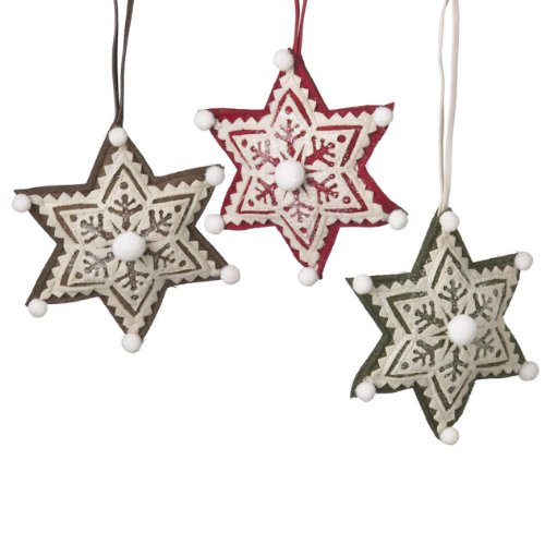 Very pretty stuffed felt snowflakes will look just perfect on your lodge or cabin themed tree. Add a touch of the homemade to you tree. Beautifully crafted snowflakes comes in three colors, brown, red and green and ready to be hung on your tree with their coordinating cords. From Seasons of Cannon Falls.