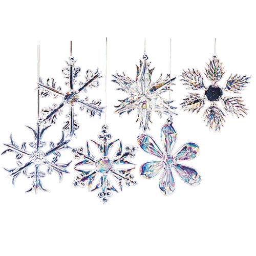 This Kurt Adler 12-Piece 2" Glass Iridescent Snowflake Glass Ornament set is a beautiful, classic way to add to the décor of your Christmas tree. Each small snowflake is textured and clear, and has a different intricate, beautiful design.